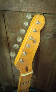 I would prefer not to repeat myself, but I have really learned to appreciate these vintage style Teles a lot. Complete set with a Guitarbuild UK Tele Alder body, the first vintage Göldo 21 fret maple neck (7,25" radius) I have bought from Fred's Guitar Parts, Allparts machine heads, Göldo hardware and electronics (3-way switch plus 250k A and B pots), and a 5 screw 1-ply black pickguard. Oh, and one unbleached radiused bone nut from Allparts too. Wow! Sold to France!