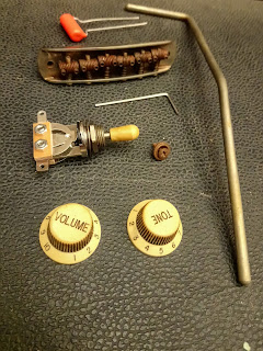 The hardware is the common hardware I buy at Thomann, Allparts vintage tuners, etc, and the bridge was bought at ADP Guitar Parts, great stuff! Speaking of bridge, the bridge on the body was actually a 7.25" radius bridge, but I have ordered a new adjustable WD Music bridge which you can see on the last pictures too along with a toggle switch that I'm including also, everything relic'd to match the other metal parts.