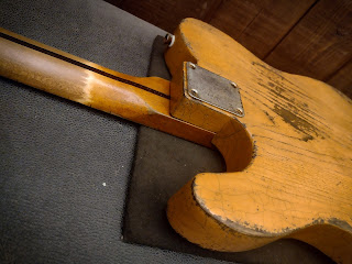 Boys and girls, this is the first of 3 complete Telecaster BBlonde sets I'm planning on doing in Ash in the weeks to come. They all will have one thing in common: 3-pc Baseball Bat Ash made in UK bodies that weigh from 2.6 to 2.7kg. This one was carved underneath the pickguard with my mini drilling machine, and it weighs now 2.3kg, which is more acceptable. Swamp Ash is more expensive and sometimes not that much lighter. I have used the usual hardware, between Allparts, Thomann and Göldo; 250k Göldo pots, 1-pc maple 9.5" Telecaster 21-fret necks with a medium C profile, and black 1-ply black pickguards. This particular set has a Göldo P90 aged cream cover and it's matching P90 pickguard.