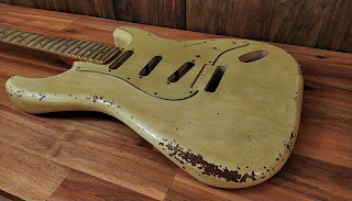 Now that I've received 4 Strat bodies from my friend César at AC Guitar Shop, I chose one in 3-pc african mahogany which had the narrowest of the neck cavities, and decided to make a set with the neck in question. The body weighs 2Kg, and I'm adding one aged cream SSS pickguard with both of these parts. Yes, the truss rod works well both ways, and it's set to zero point right now, meaning, flat.